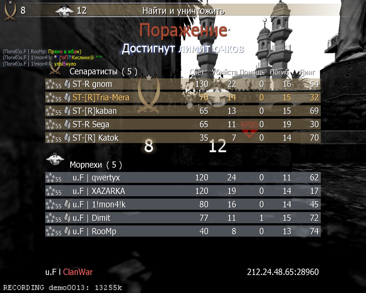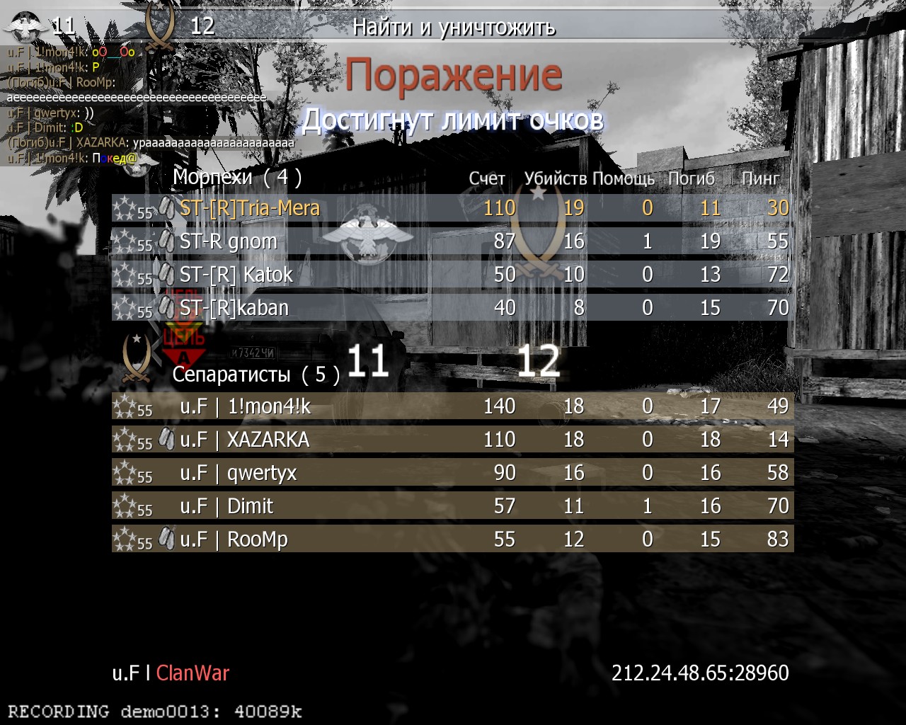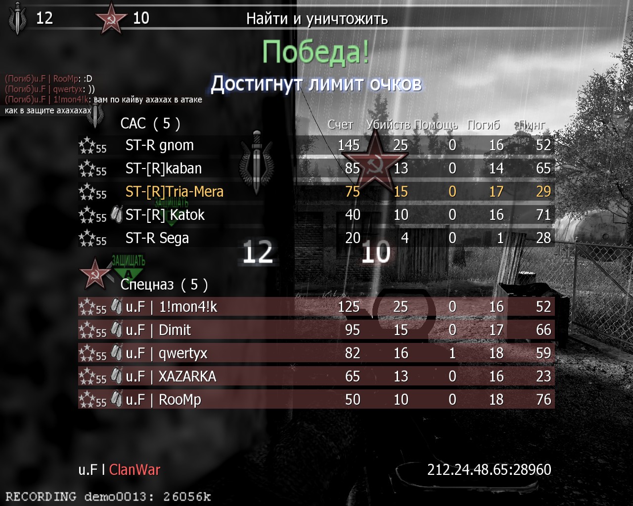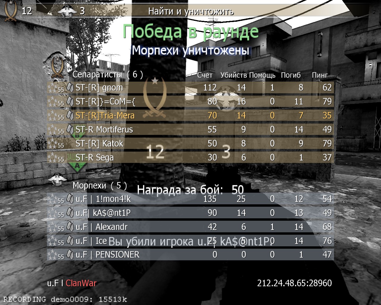 | Ну что ребят, всех поздравляю с победой! Все молодцы, отыграли на ура!!! Теперь к делу:Играли сегодня с кланом U.F, 6 на 6. Мы выиграли со счетом 2:0. Так держать дальше!!! В составе были Игорь-Katok, Серега-Mortiferus, Влад-CoM, Женя-Gnom, Серега-Sega и ваш покорный слуга- Tria-mera. Следующая КВ предлагаю провести с кланом Steel Soul. Вот скрины: