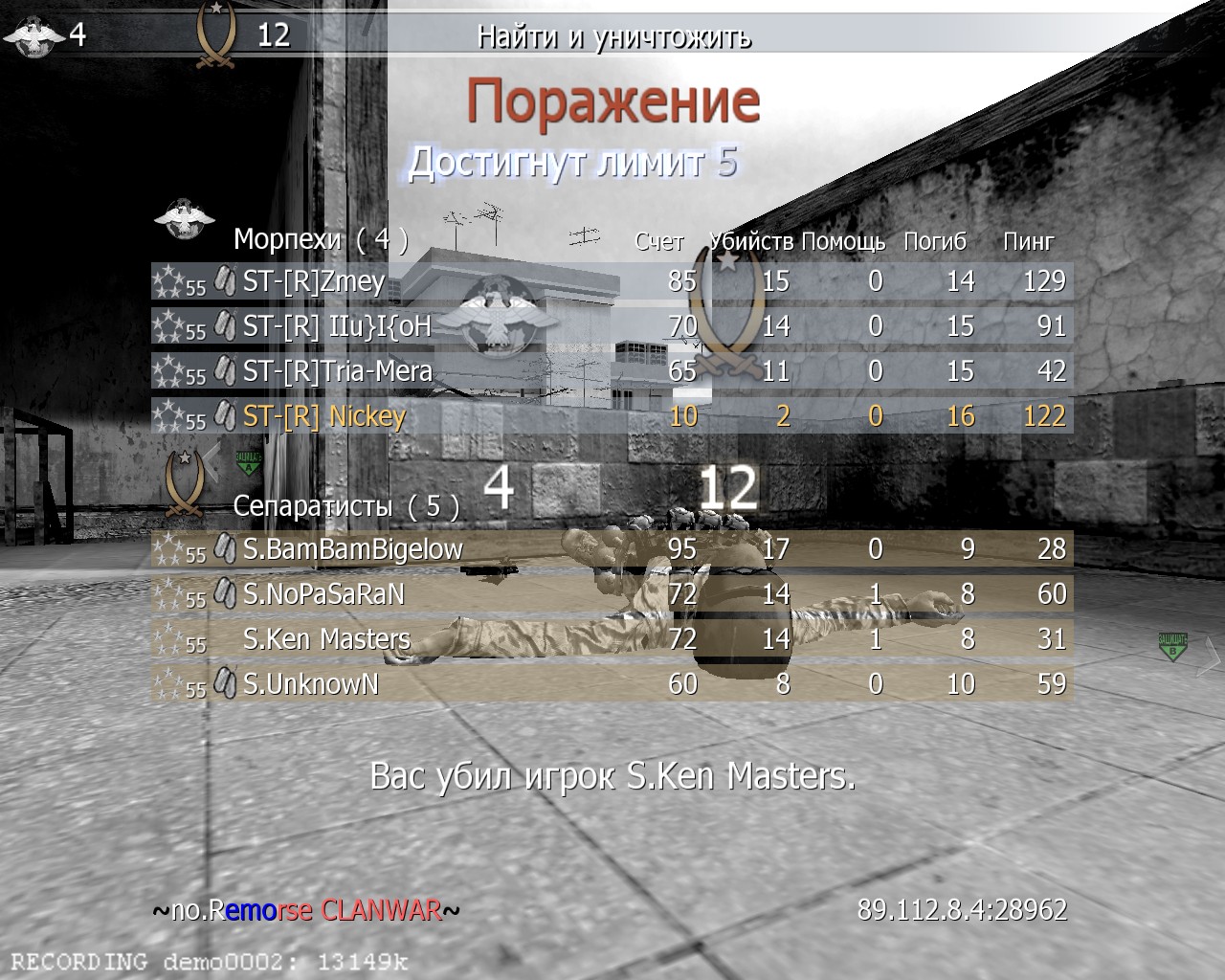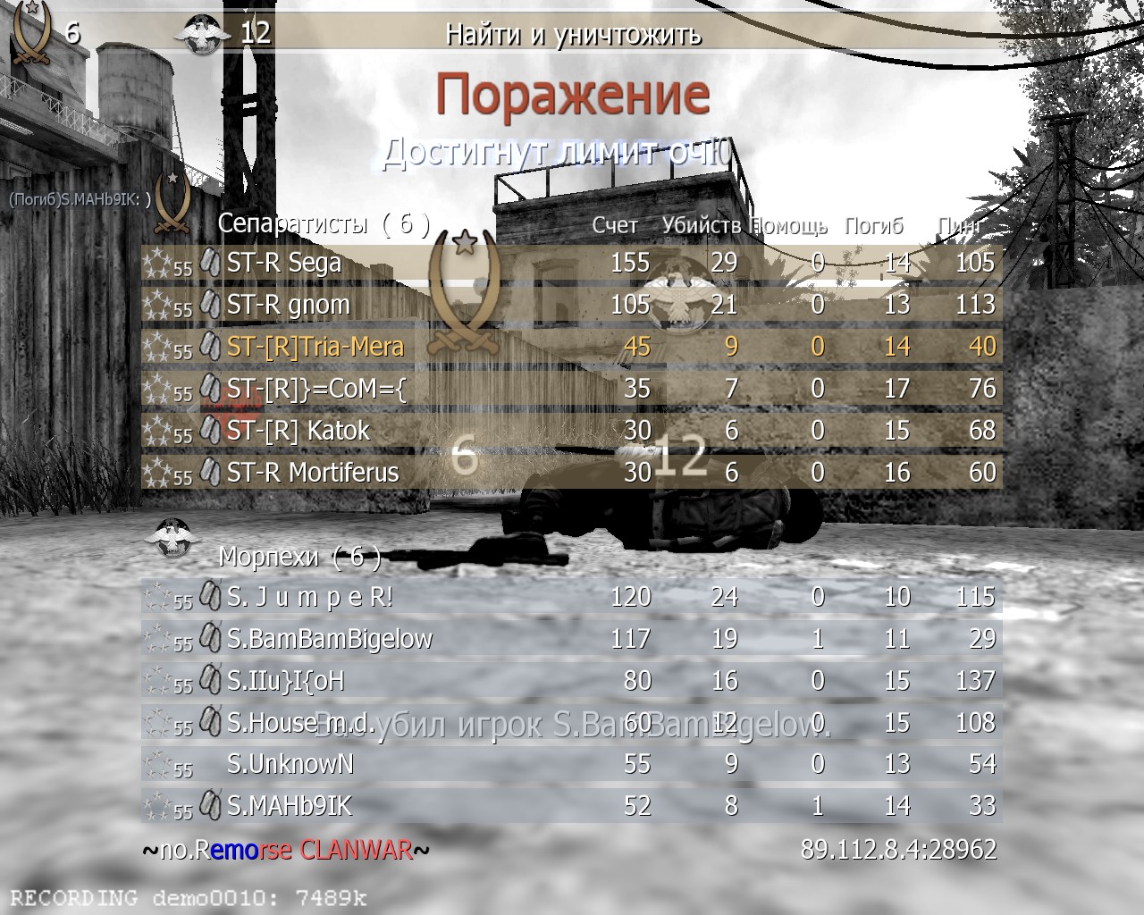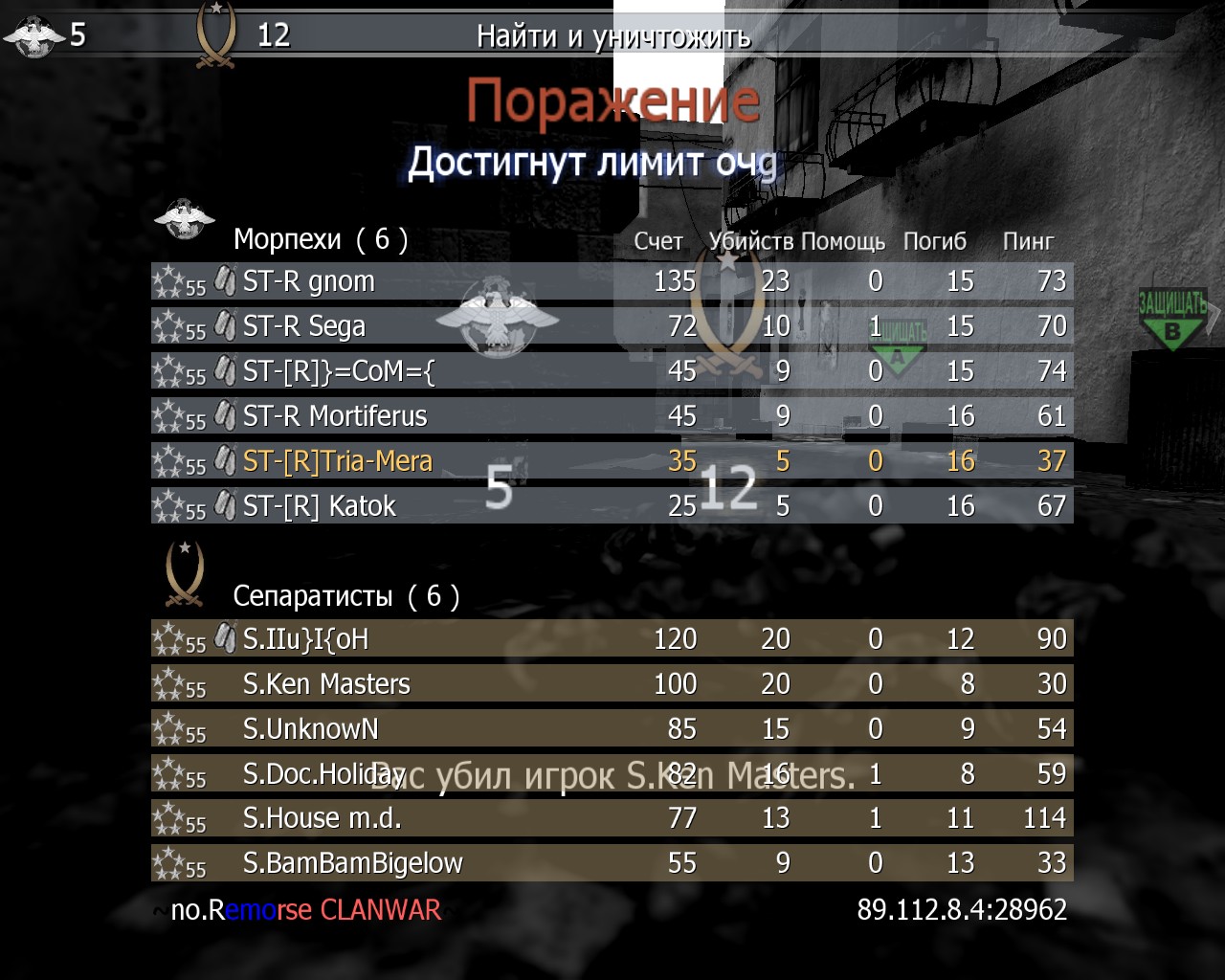 | 23 октября 2010 года играли с командой Steel Soul и проиграли 0:2 Играли 5 на 5 на карте Площадка и 4 на 5 на карте Крушение (Иван отвалился:( ) Очень достойные соперники. Нужно сыграть с ними матч реванш. Вот результат второй игры: