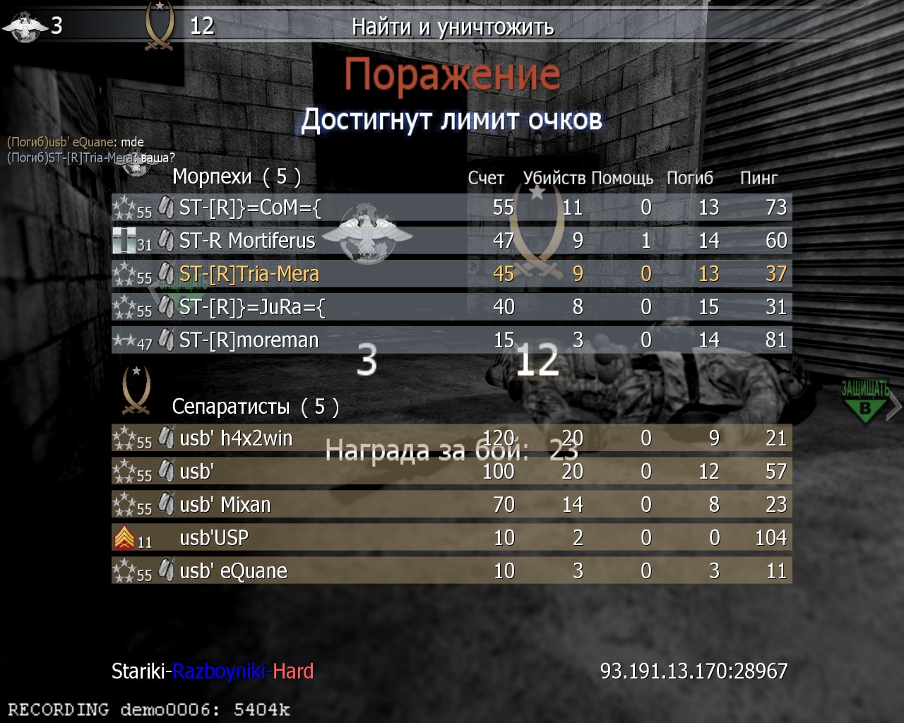 | Вчера сыграли два 5 на 5 КВ с ребятами из кланов USB и Steel Soul. К сожалению мы проиграли, но игра была очень интересная!!! Есть чему нам поучиться и есть над чем поработать, но в общем наши парни молодцы, боролись до последнего! Правда есть вопросы к клану USB! Из трех дёмок запрошенных у них получили только одну, так что стоит вопрос о выставления им технического поражения! Скрины здесь:
