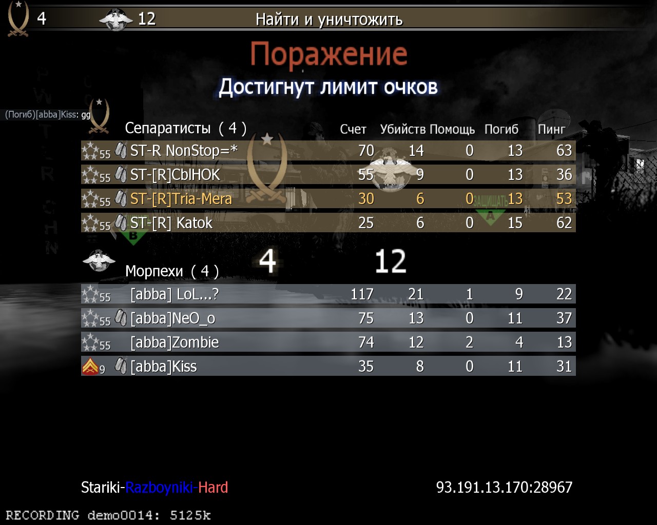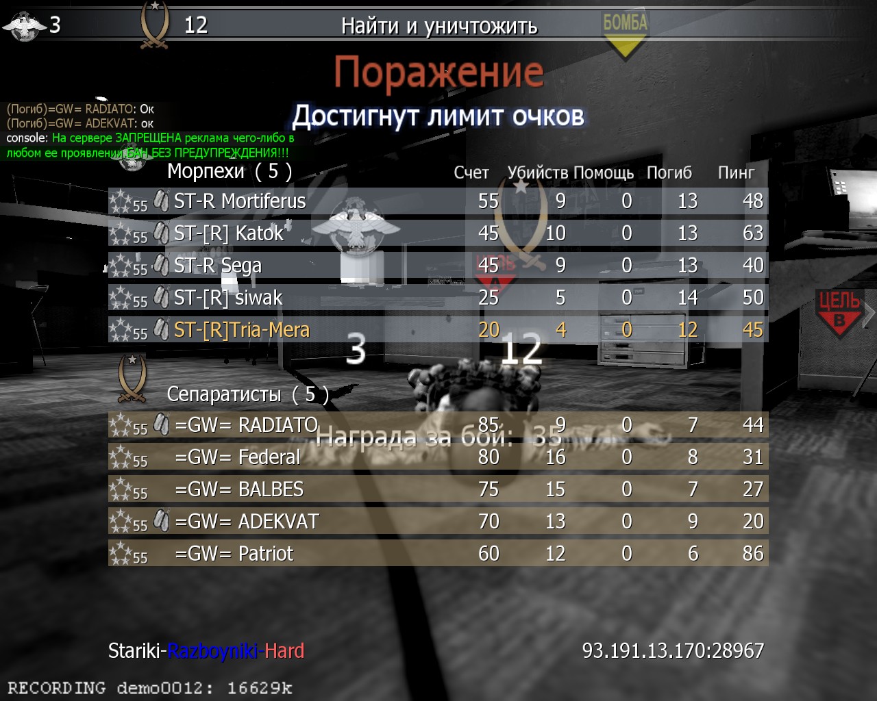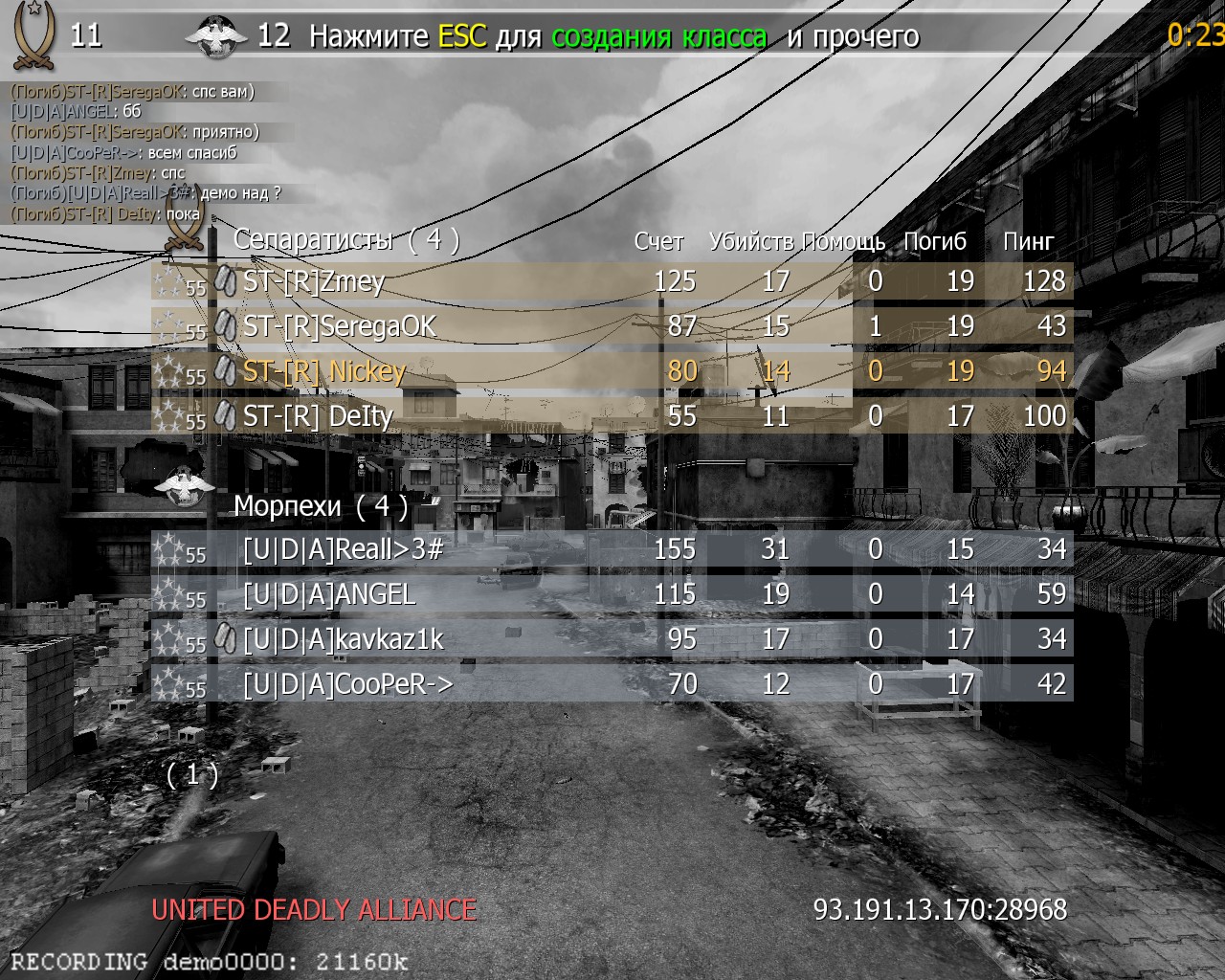 | Вчера 21 октября играли КВ с [U|D|A]. Мы проиграли со счетом 0:2 Сделал скриншот только в конце игры: Игра мне понравилась. Кому интересно смотрите демку: Когда делал скриншот, уже из игры вышли Сергей (Амни) и Саша (Мореман). Ребята спасибо за хорошую игру!